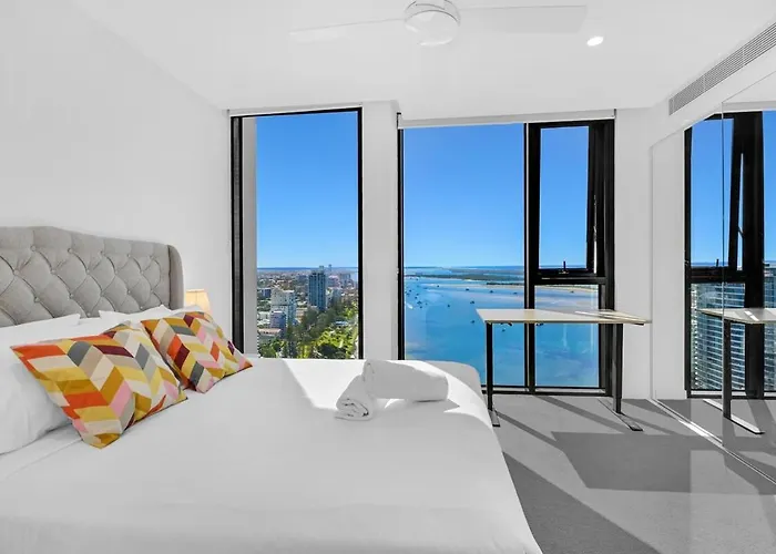 Das 84 m² große Apartment Brand New High-Level Ocean View 2 Bedroom Retreat Gold Coast ist eine großartige Unterkunft im Viertel Southport von Gold Coast, 20 Minuten zu Fuß vom Australia Fair Shopping Centre entfernt.